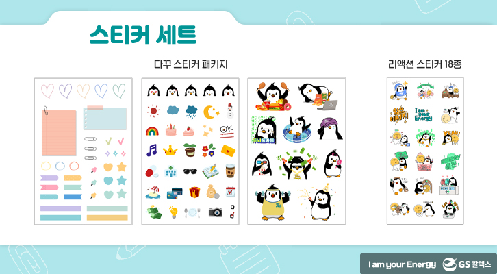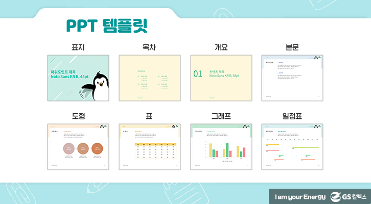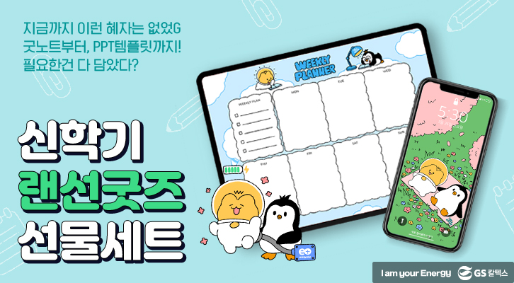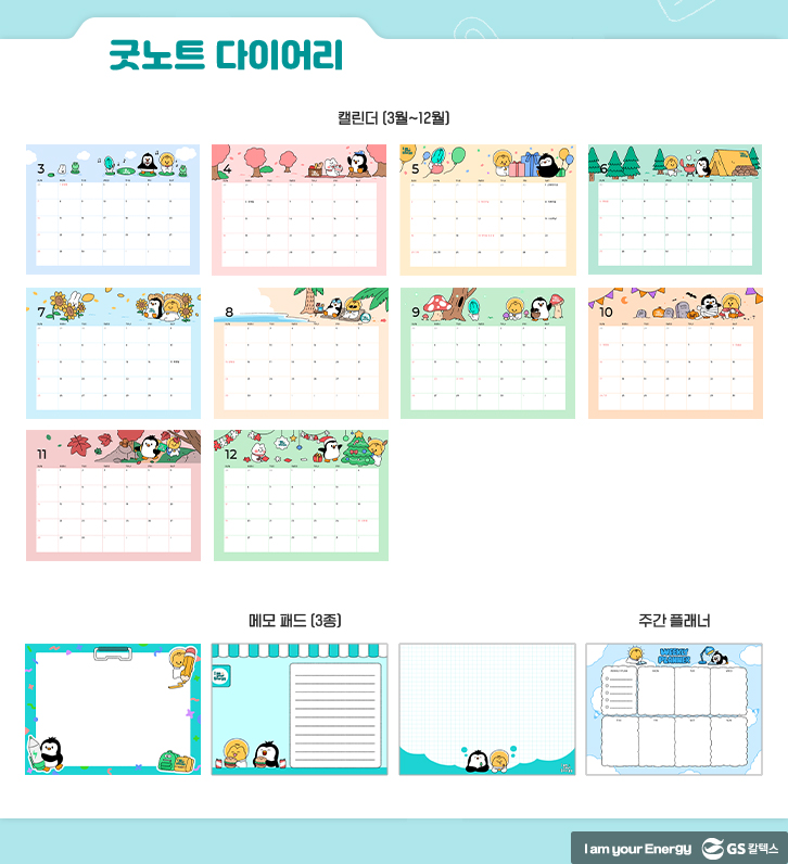 GS칼텍스의 마스코트 펭군과 전구별 캐릭터가 포함된 굿노트 템플릿, 다이어리 속지, 스티커, 휴대폰 배경화면, ppt 템플릿입니다. 다양하고 알찬 무료 자료예요!