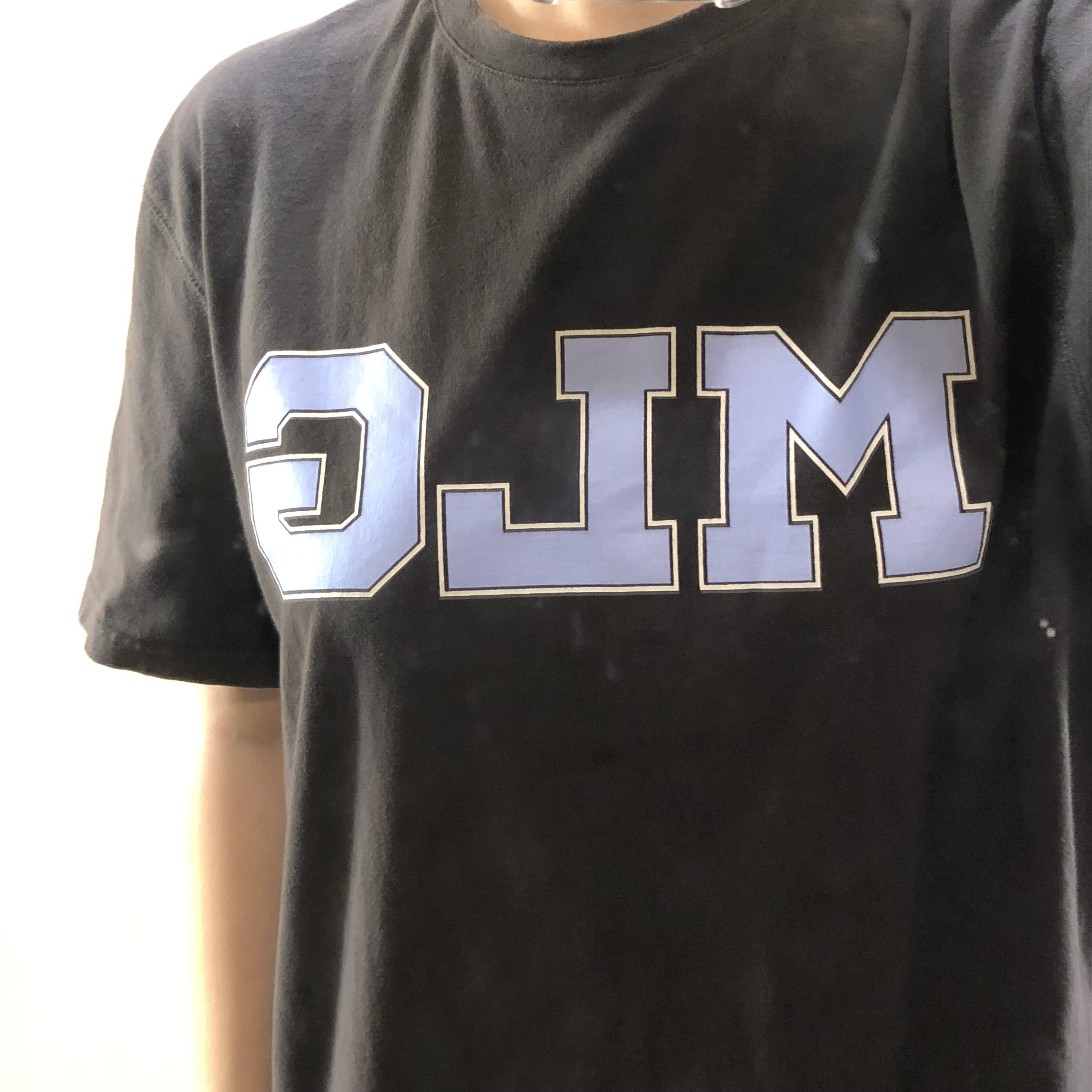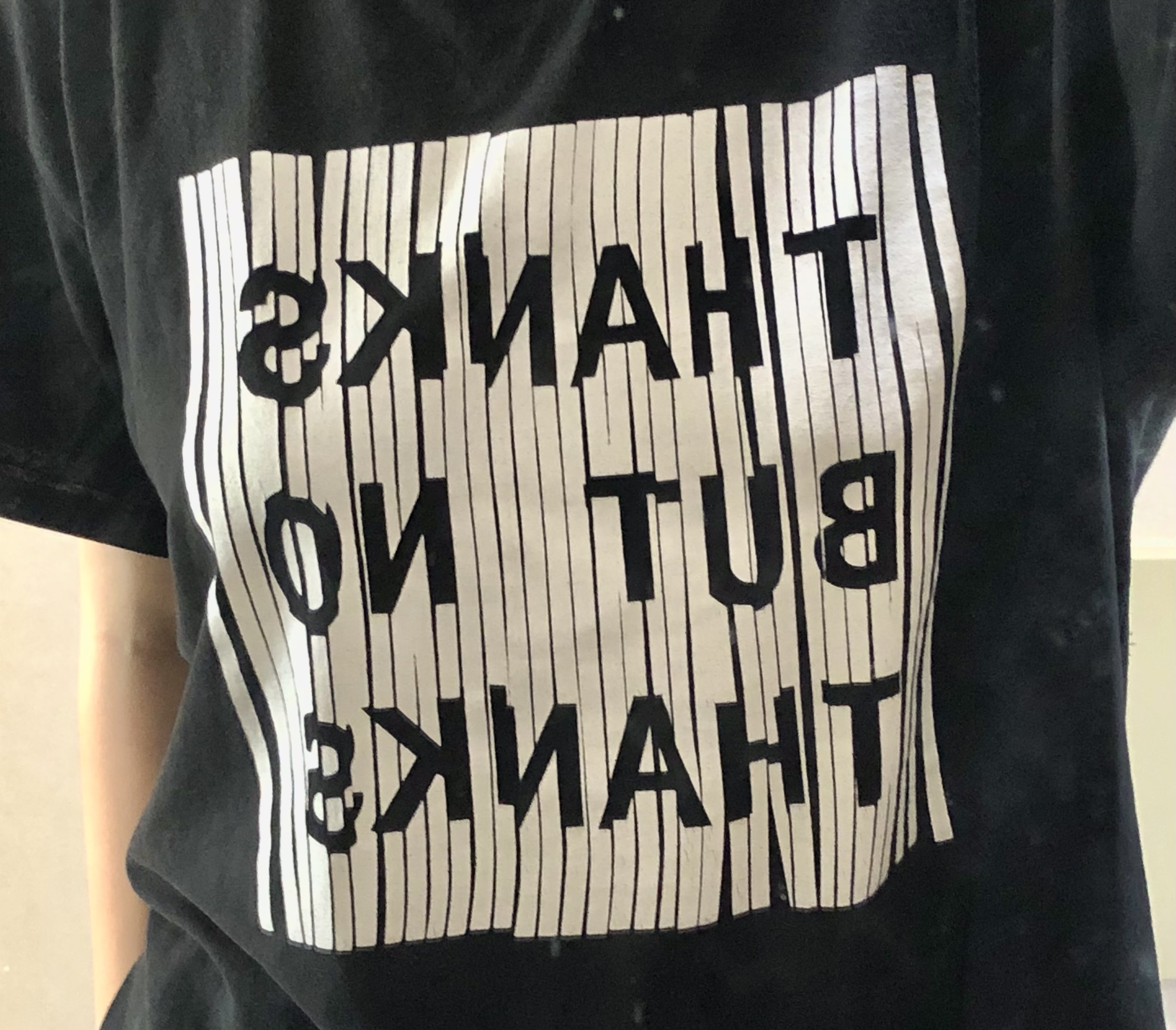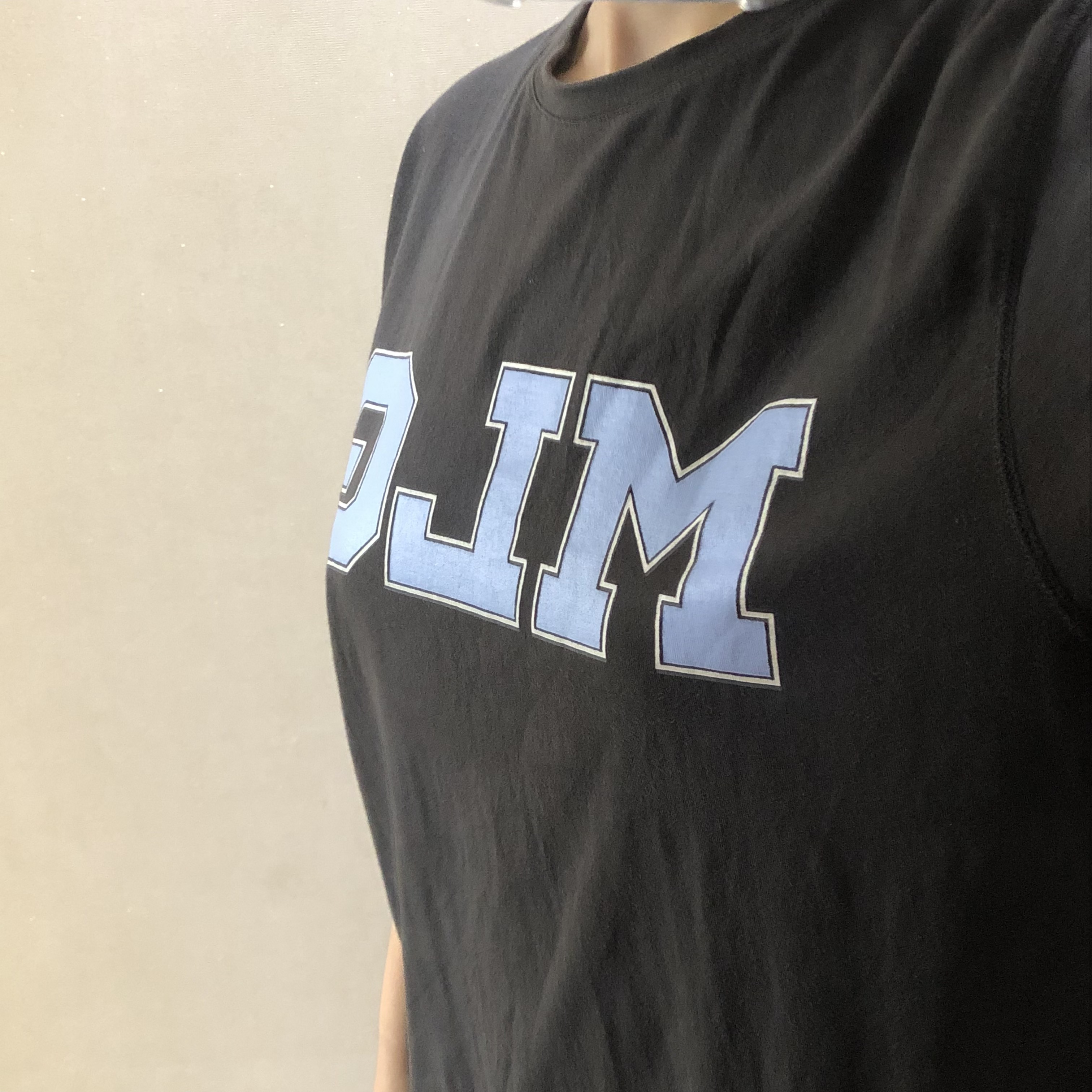 ▼ 앞에 프린팅 있는 검정 반팔티. 얇은 편임에도 큰 프린팅이 있어서 티 안 난다.
