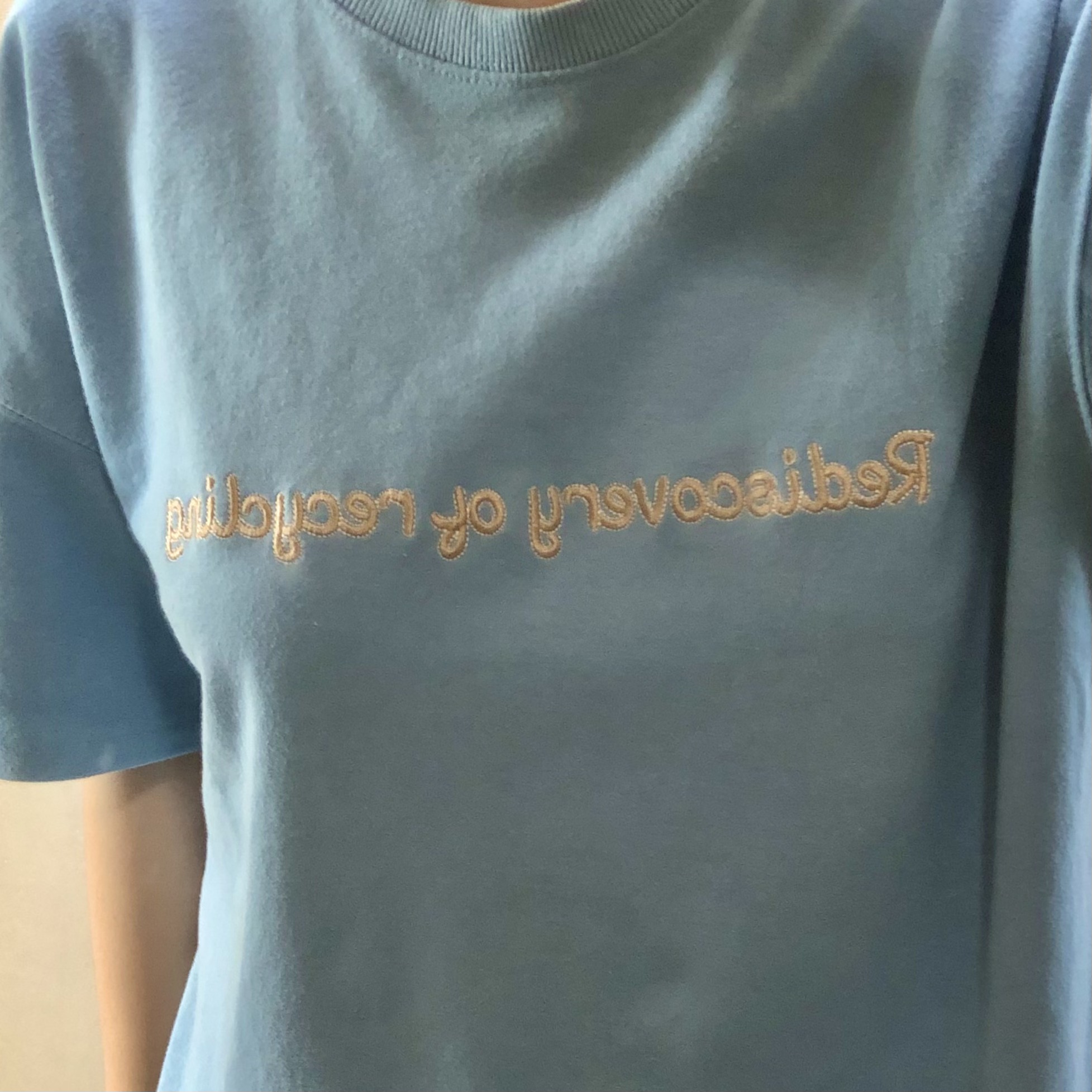 ▼ 약간 흐물거리는 재질의 하늘색 반팔티. 재질이 이래서 그런가 좀 티 난다. 특히 내밀면 동그란 니플패치 모양이 살짝 보임ㅋㅋㅋ