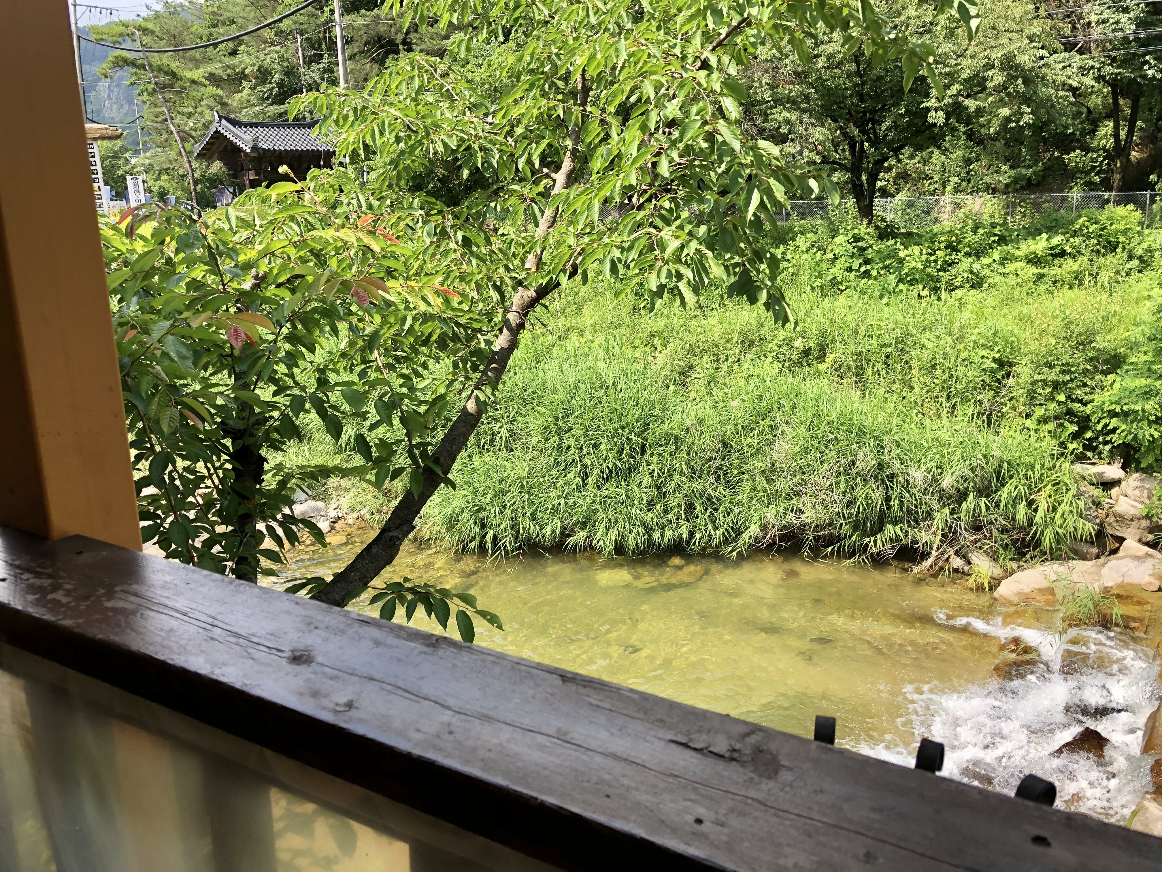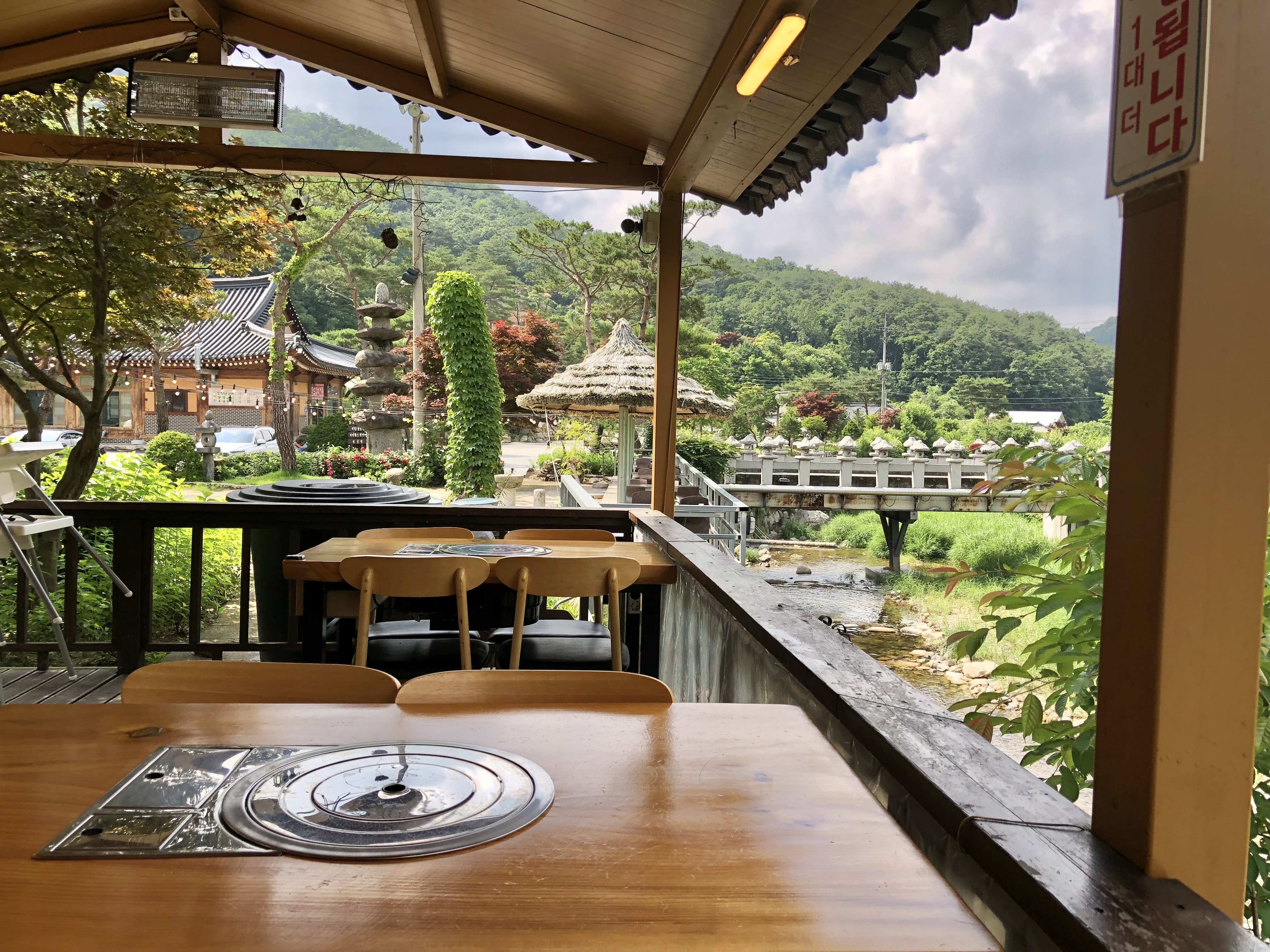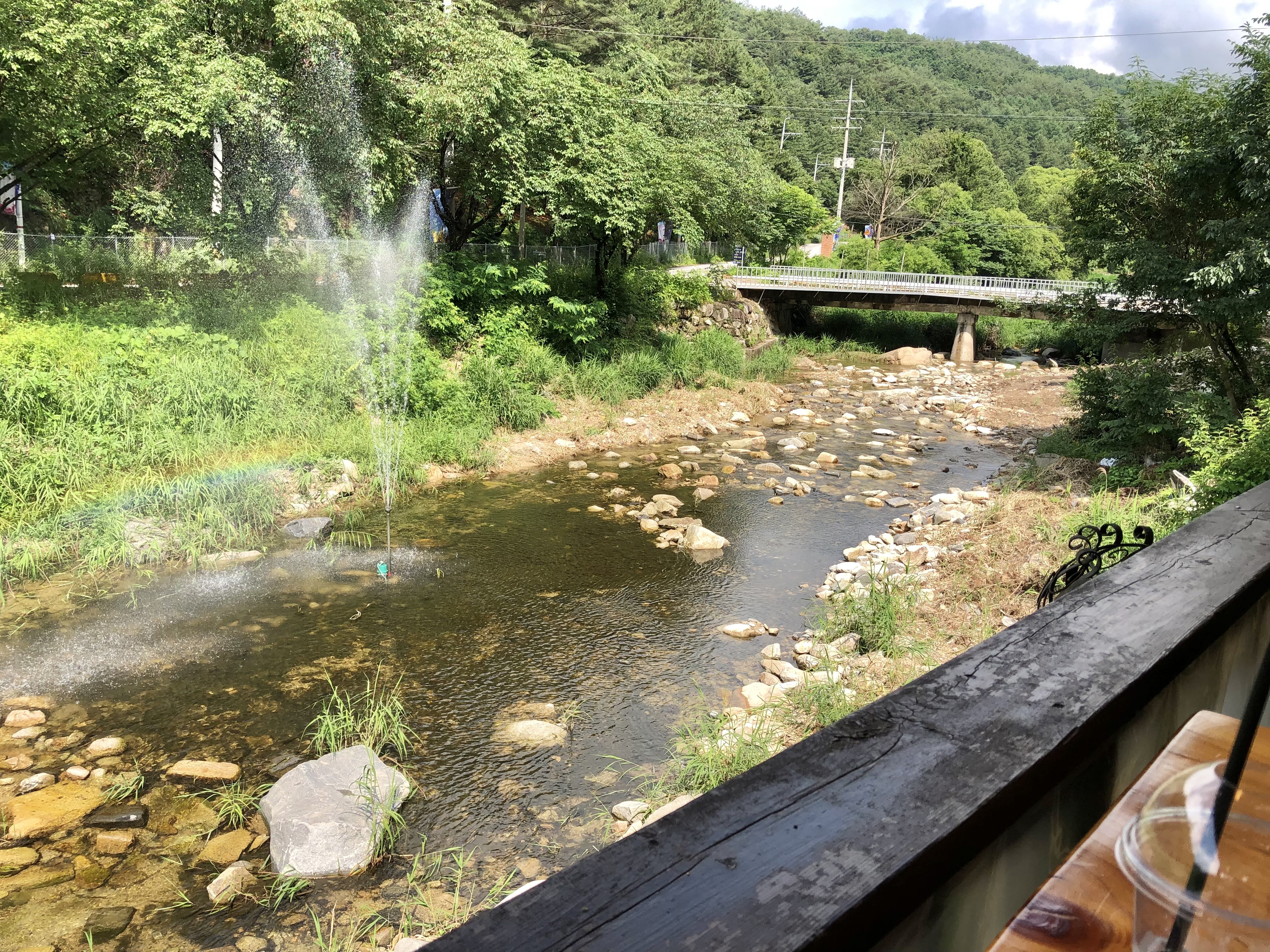 테이블 옆에 하천이 흐르는데~ 와~ 무지개도 보이고