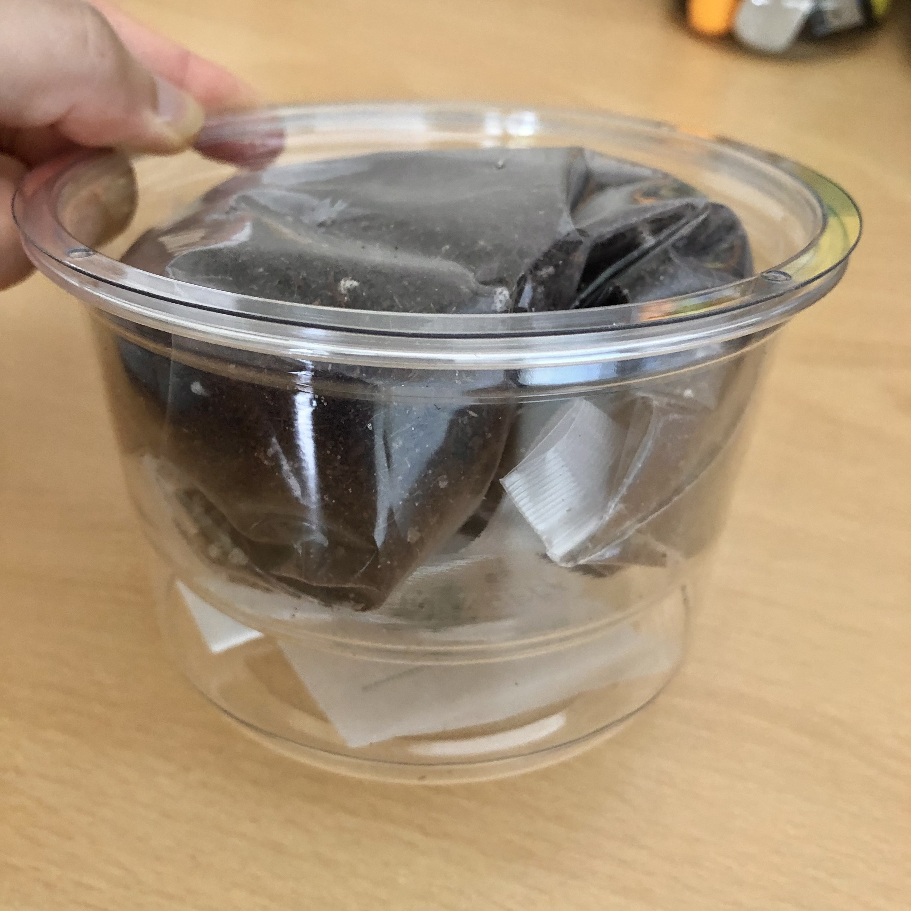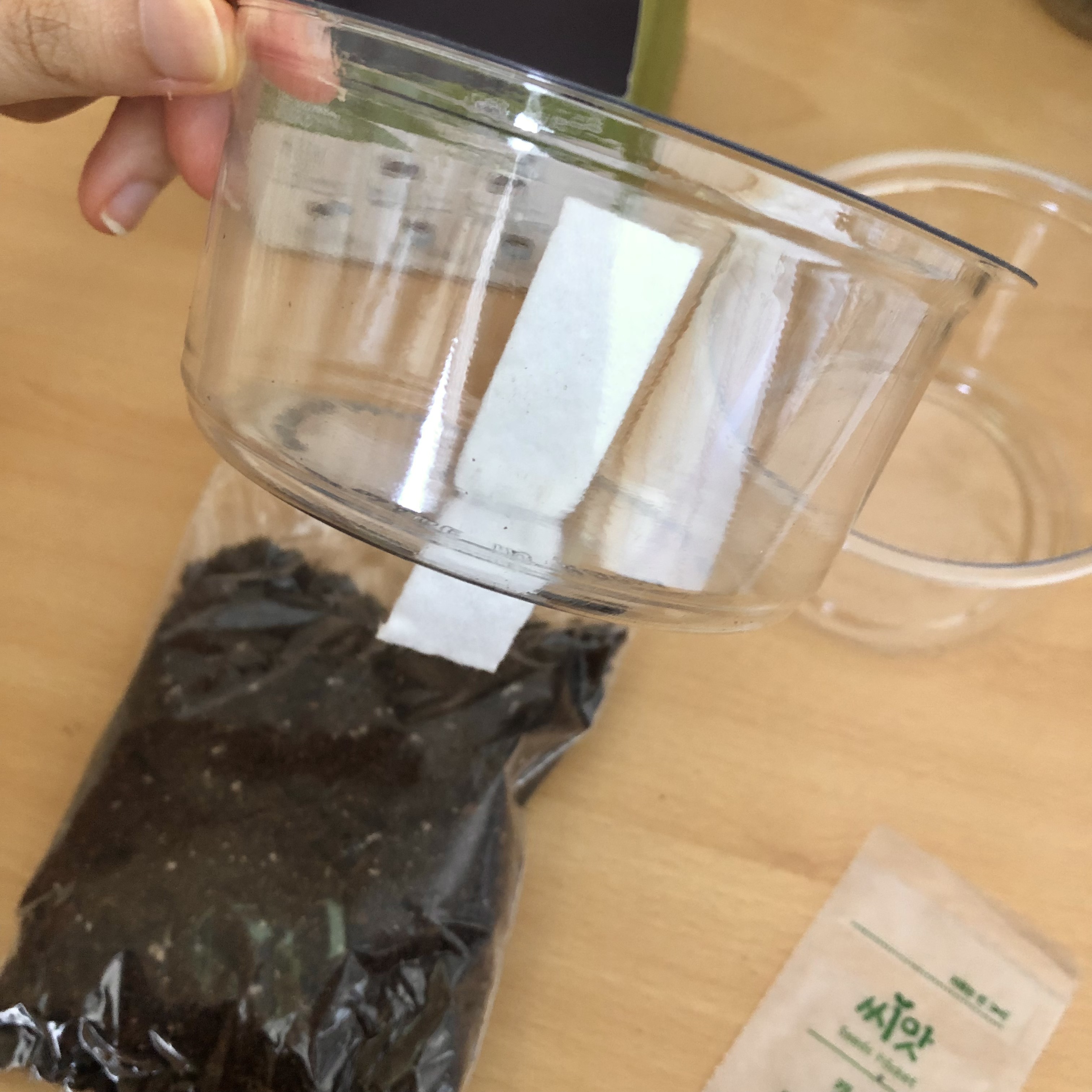 3. 흙을 조금 남기고, 부직포를 끼운 작은 화분에 흙을 다 부어준다.