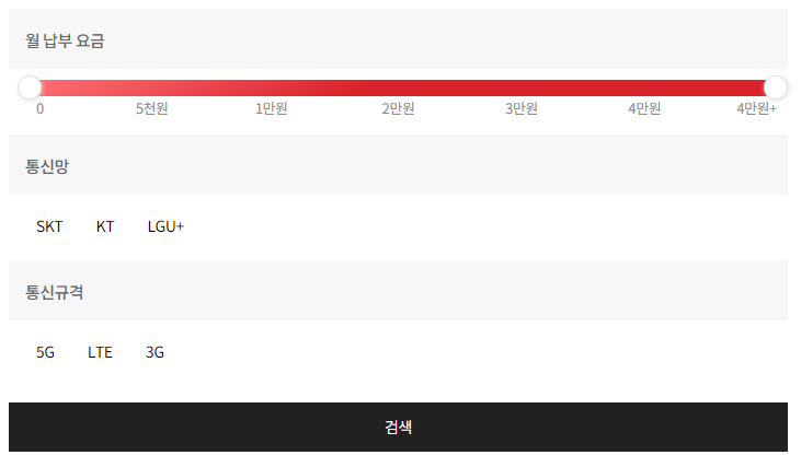 이벤트 확인 전에 요금제를 먼저 보고 싶다면, 요금제 페이지를 눌러 보면 된다. 원하는 가격, 통신망, 통신규격 (5G, LTE, 3G)을 선택하여 알뜰 통신사별로 요금을 볼 수 있다.