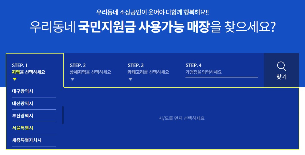 정부가 만든 공식 사이트다. 우리 동네에서 국민지원금 사용 가능한 매장 알려줌!