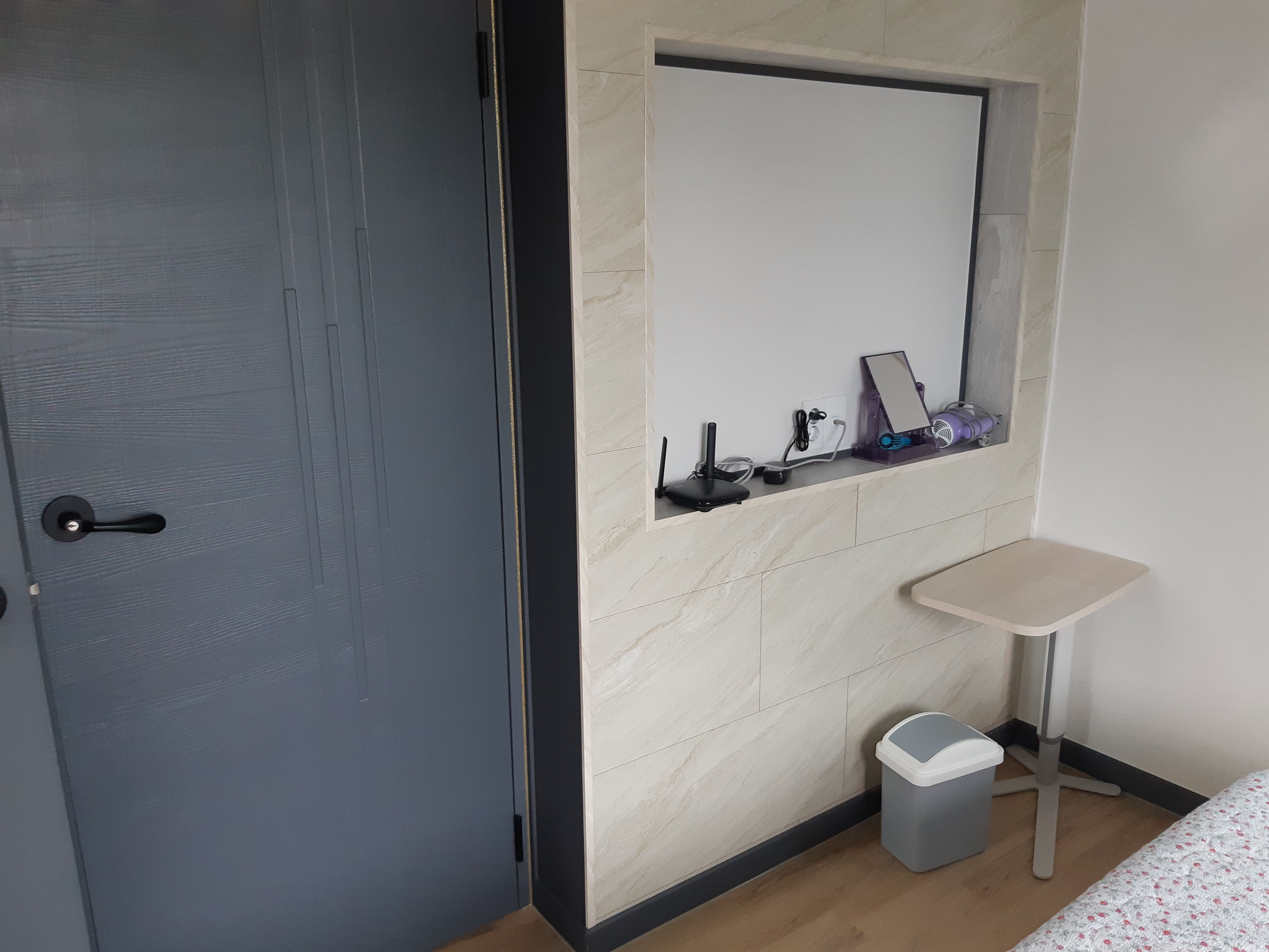 공유기 밑에 공유기 비밀번호 적혀있고, 고데기, 헤어드라이기 등도 있다.