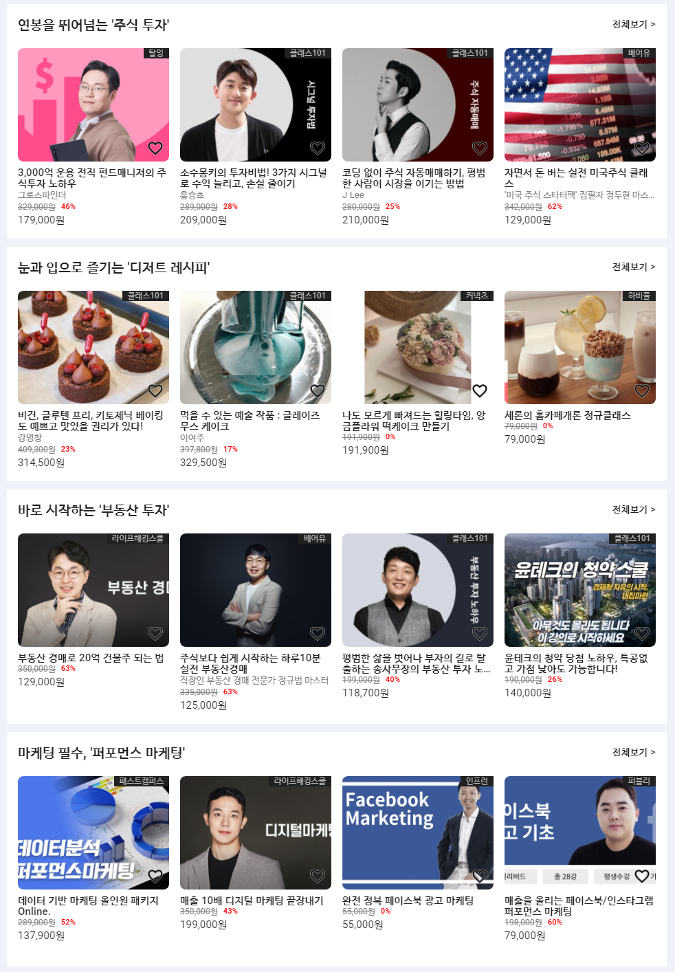 이름을 들으면 예측 가능하다시피, 온라인 상에 존재하는 강의들을 카테고리별로 묶어서 다~ 보여줍니다.