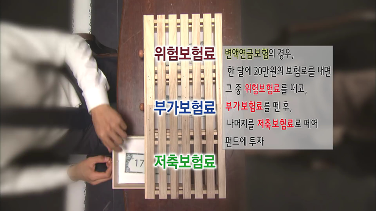 한참 인기 있었던 변액보험의 경우, 한 달에 20만원의 보험료를 내면 그 중 위험보험료를 떼고 사업비, 수수료 등의 부가보험료를 뗀 다음에 나머지를 88~95%를 저축보험료로 따로 떼서 펀드에 투자. 그리고 수익이 나면 그것을 연금형태로 돌려주는 보험입니다.