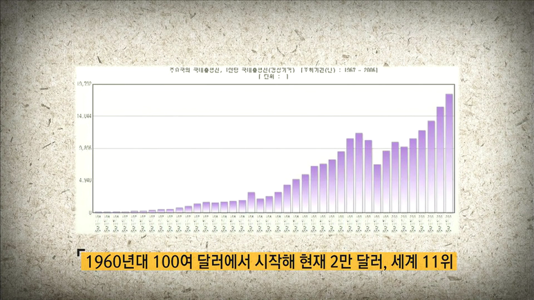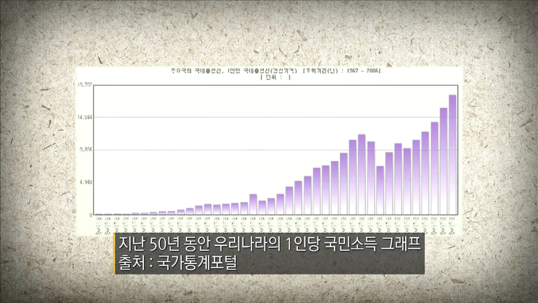 지난 50년 동안 증가해온 국민소득 그래프. 소득이 늘어 세계 11위를 차지했지만 행복도는 너무나도 낮다.