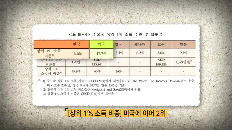 한국도 미국과 마찬가지인 상황. 우리나라는 심각한 소득 불균형 상태이며 2012년 기준 상위 1%가 한 해 버는 돈이 전체의 16.6%를 차지할 정도. 미국에 이어 2위인 수치.