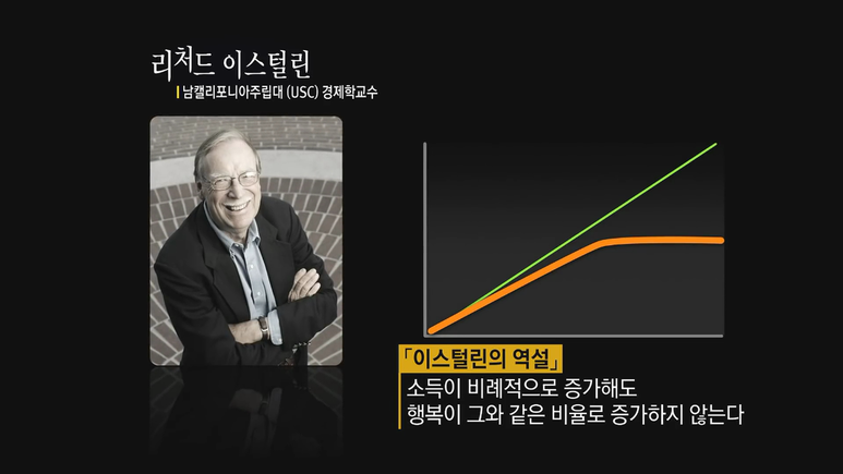 문제는 이것입니다. 우리가 느끼는 행복도가 경제 성장과 비례해서 증가하지 않았다는 것입니다. 이는 미국의 경제학자인 리처드 이스털린이 주장한 소득이 증가해도 행복은 정체된다는 '이스털린의 역설'을 고스란히 적용하고 있습니다.