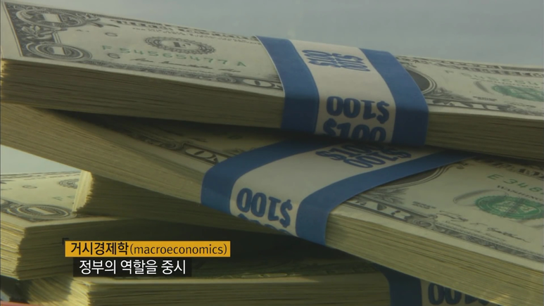 반면에 거시경제학은 국민소득, 이자율, 환율 등 국가 전체와 세계에 관한 경제현상을 연구하는 학문입니다. 정부의 계획적인 정책으로 가계와 기업을 움직여야 한다는 주장이죠.