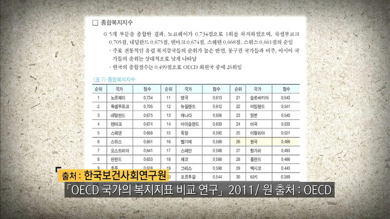 우리나라는 30개 국가 중에서 26위. 거의 꼴찌의 성적입니다. 1위는 노르웨이, 2위는 룩셈부르크, 3위는 네덜란드, 4위는 덴마크, 5위는 스웨덴. 주로 전통적인 유럽의 복지국가들이 높은 순위를 차지하고 있습니다.