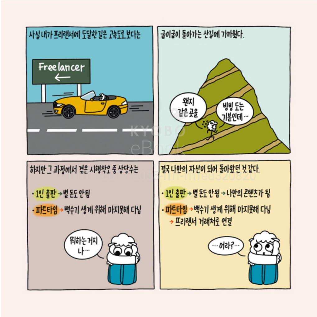- 어떻게 보면 '그저 버티다보니 어느 순간 일이 풀렸다.'는 식의 우연한 결말로 비칠지도 모르겠다. 하지만 회사를 그만두고 프리랜서로 자리를 잡기까지 결코 짧지 않았던 그 시간 동안 내가 뛰어들었던 크고 작은 도전들을 생각하면, 이 작은 성취가 그저 우연한 선물이라고만 여겨지지는 않는다.